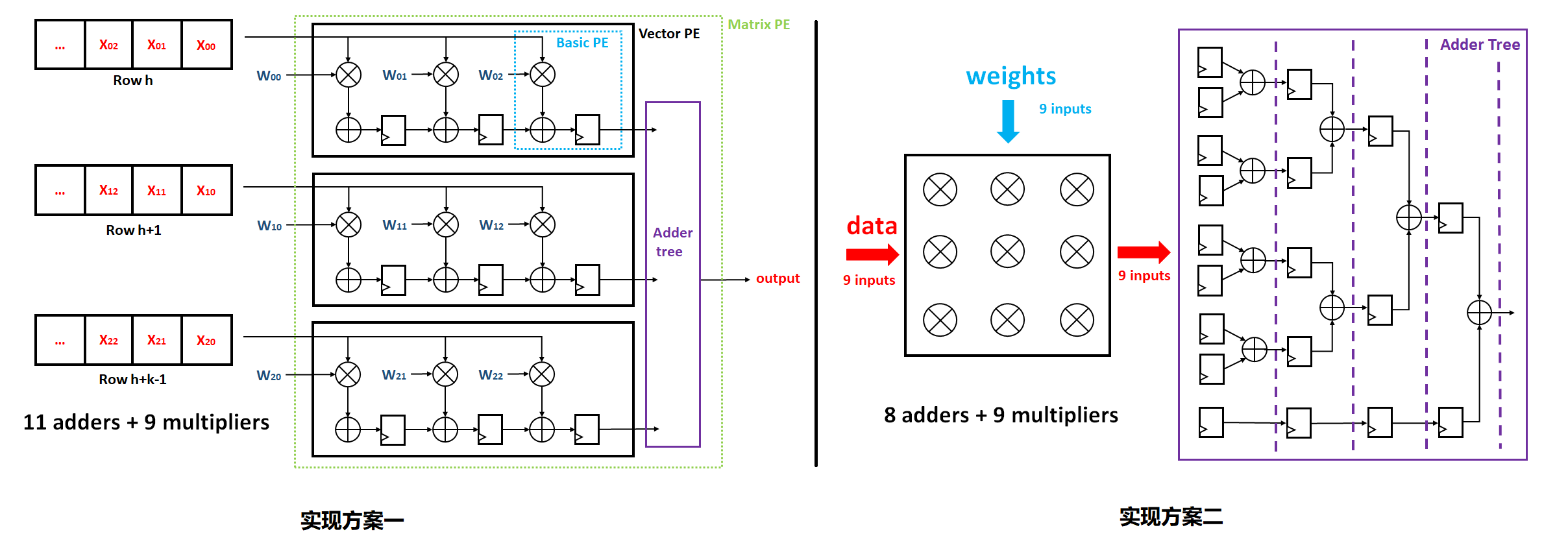 卷积计算在硬件电路实现时可以有效利用其并行性,以 3x3 的卷积核为例,常见的硬件实现方案都是使用乘法矩阵和加法树进行计算,以下是两种常见的硬件实现方案: