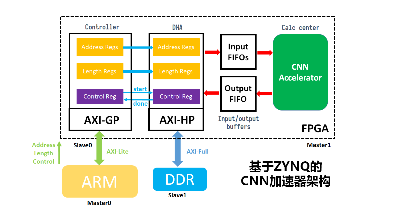 CNN 加速器的架构主要包括输入缓存,加速器ip以及输出缓存。FPGA 的数据读入主要利用 AXI-HP 接口,从 DDR 中来获取图片数据和参数数据,然后加速器计算完成后再将结果写回 DDR 中,其加速器的架构图如图3所示: