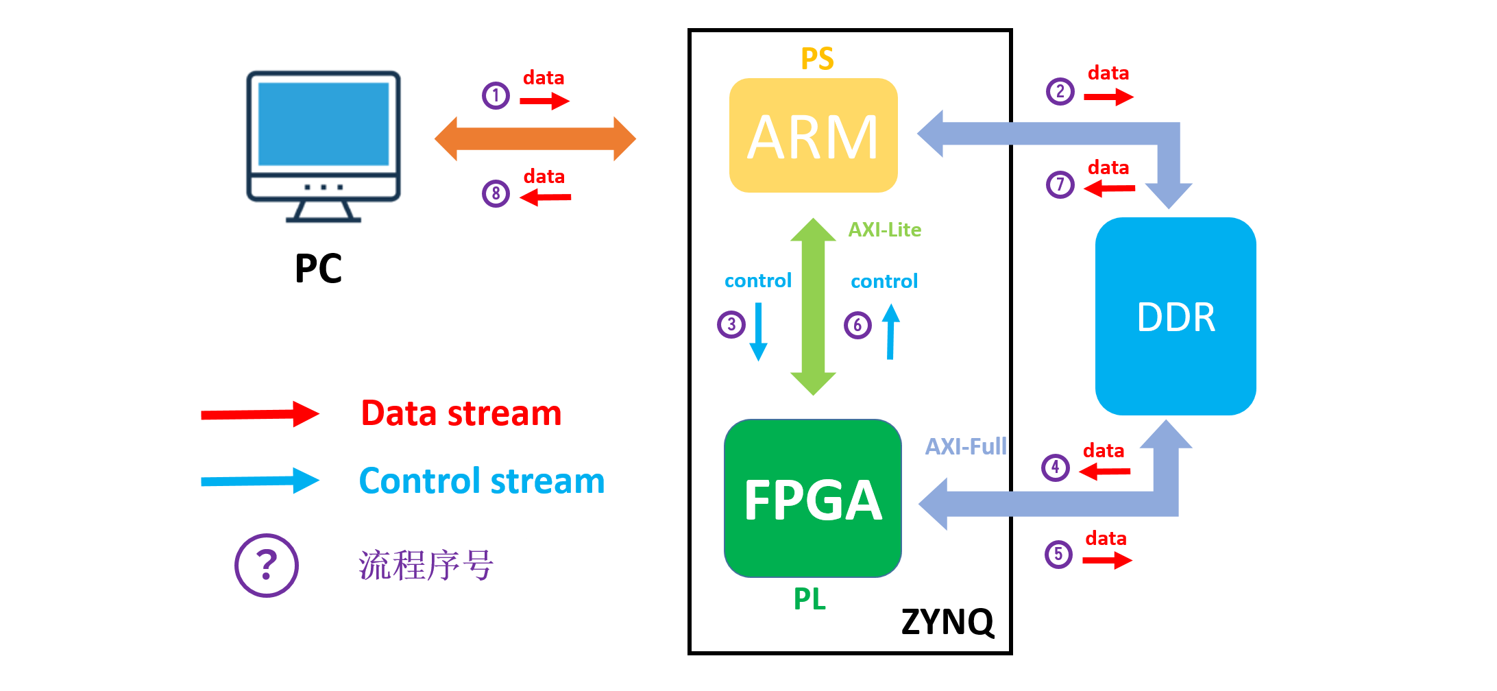 实现 CNN 加速器的整体实现流程主要通过 PC 端将手写数字图片发送至 ZYNQ 平台(包括 ARM(PL) 和 FPGA(PL) 即 ARM 接受图片数据并存放在 DDR 中,通过 AXI-GP 接口发送指令给 FPGA ,FPGA 接受到开始指令从 DDR 中读取图片数据和权值偏置参数,并完成卷积神经网络的计算,计算完成后反馈回 ARM ,最后再由 ARM 将计算结果发送回 PC 端并显示识别结果。其整体架构图如图2所示: