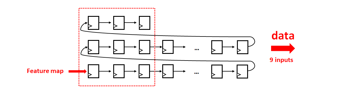 由于输入图像是以数据流形式输入,而卷积计算通过滑窗对卷积核内的数据进行乘累加操作,因此我用三个移位寄存器组将输入数据流分成三行,对应于 3x3 的卷积核。同理,权重数据流也是类似操作,如图5所示: