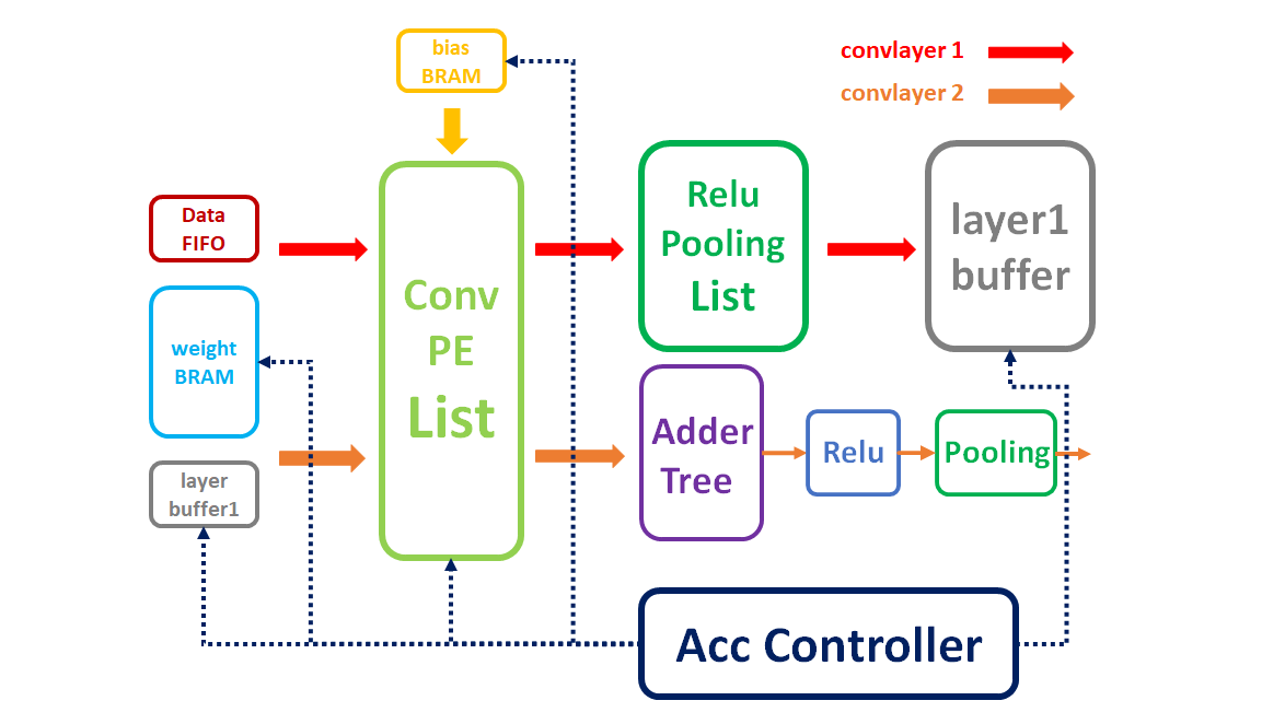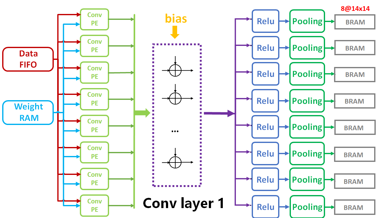 根据网络结构,第一层为单通道特征图像输入,卷积核个数为8,则一次卷积核列表计算就可以完成卷积层1 的计算,之后再经过8个 Relu 和池化电路,得到8个通道的图像输出。同时,为了尽可能地减少在数据的读取加载中消耗太多时间,我将卷积层1的输出结果存放在了FPGA的片上RAM中(Block RAM),以方便后续计算层快速读取数据,具体硬件电路架构图如下: