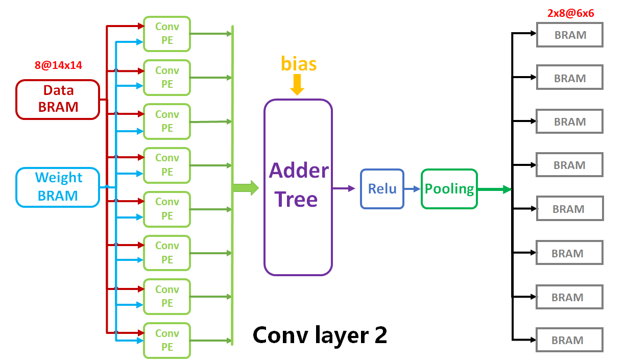 对于第二层网络,由于此时输入特征图像的通道数为8,卷积核个数为16,因为开发板的DSP资源有限,因此完成卷积层2的计算需要调用16次的卷积核列表,加法树,Relu和池化电路。数据的输入由之前存放在BRAM的图像缓存和权值缓存构成。具体的硬件电路架构图如下: