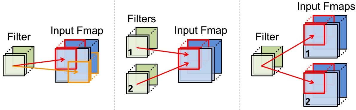 本项目中的网络模型结构有5层(除去输入输出层),包括卷积层1,池化层1,卷积层2,池化层2,全连接层。加速卷积层计算是加速该网络的核心,在卷积运算中,我们经常要对数据进行读写操作,因此需要对数据进行复用,根据卷积运算的并行方式,即有如下三种数据复用的方式:
