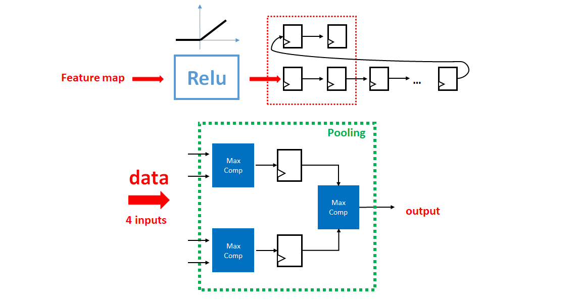 池化电路的设计与之前的卷积电路架构类似,也是利用移位寄存器进行滑窗操作,不同的是池化区域的大小为 2x2,且无权重参数,因此不需要乘法矩阵和加法树。本项目中的卷积神经网络采用的是最大值池化,因此只要将原先乘法器的位置换成最大值比较器即可,该池化电路设计原理图如下:
